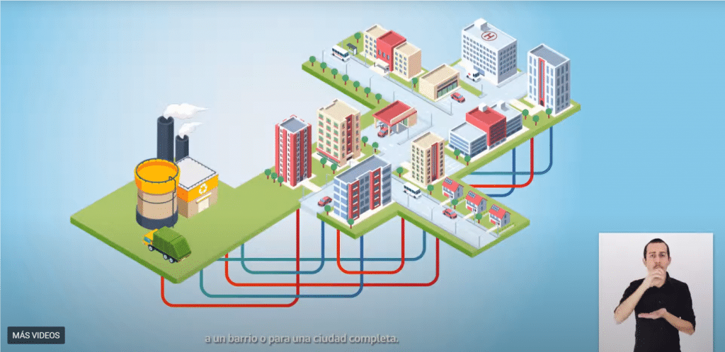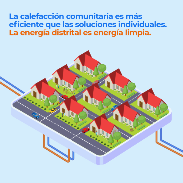 La energía distrital engloba los conceptos de “calefacción distrital” y “enfriamiento distrital”, siendo el primero de ellos el más conocido en nuestro país. Por su parte, la calefacción distrital abastece de calefacción y/o agua caliente sanitaria, al conjunto de edificaciones conectadas en la red, mientras que el enfriamiento distrital, abastece de refrigeración y/o climatización a las edificaciones.